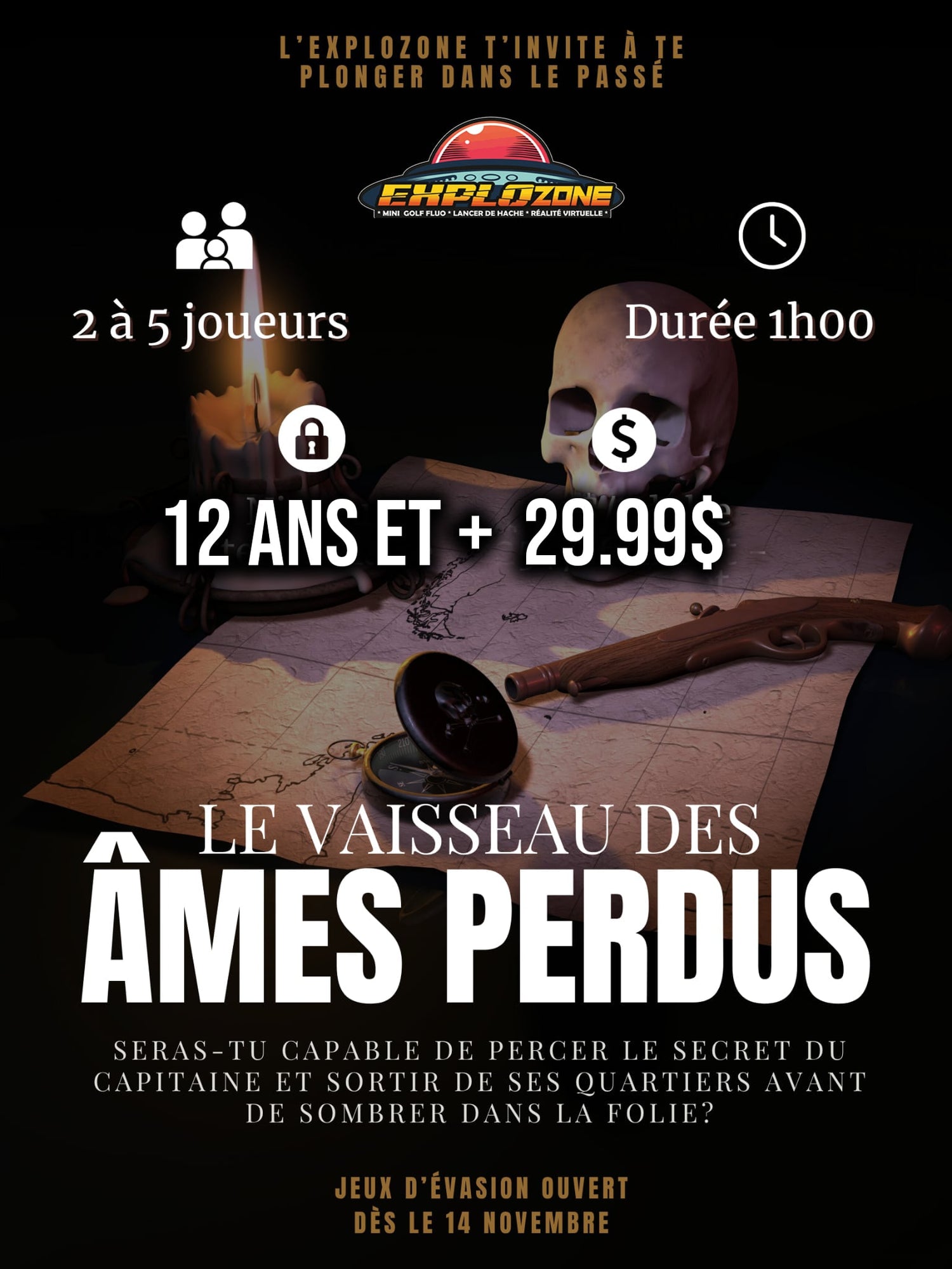 Plonger dans une aventure immersive à bord du vaisseau des âmes perdues. Vous devrez résoudre des énigmes afin de sortir du navire. En équipe de 2 a 5 joueurs. Durée de l’activité maximum de 60 minutes. Les enfants de moins de 16 ans doivent être accompagnés d’un adulte.
